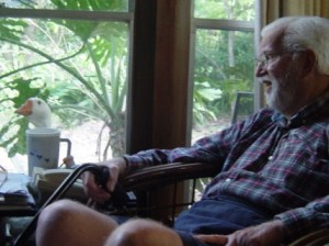 Gator Goose stood outside the large glass window staring at my dad, who was in the sunroom sitting in his favorite chair. Moving the newspaper that had been strewn across his lap, and leaving his coffee cup, a stack of books, and cans of cashews, walnuts and peanuts piled beside the window, Dad looked back at the goose and stood up. It was now time for lunch, so Gator Goose proceeded with his daily routine, a routine he had been following for several years.