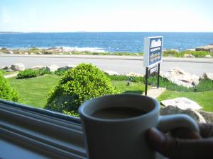 My favorite breakfast place opened this weekend, where I can enjoy breakfast at a table overlooking the vast expanse of the North Atlantic. I took the morning off today in order to visit this breakfast spot. I had extra time to meditate on “life and Godliness” as I drank my coffee Usually on Monday mornings Wyndham is with me, but due to an unexpected semi-emergency he needed to take care of, I went by myself (well, God was with me.) As the only patron in the restaurant (this is the very early season) I appreciated the opportunity to practice the scripture in Psalm 46:10-11
