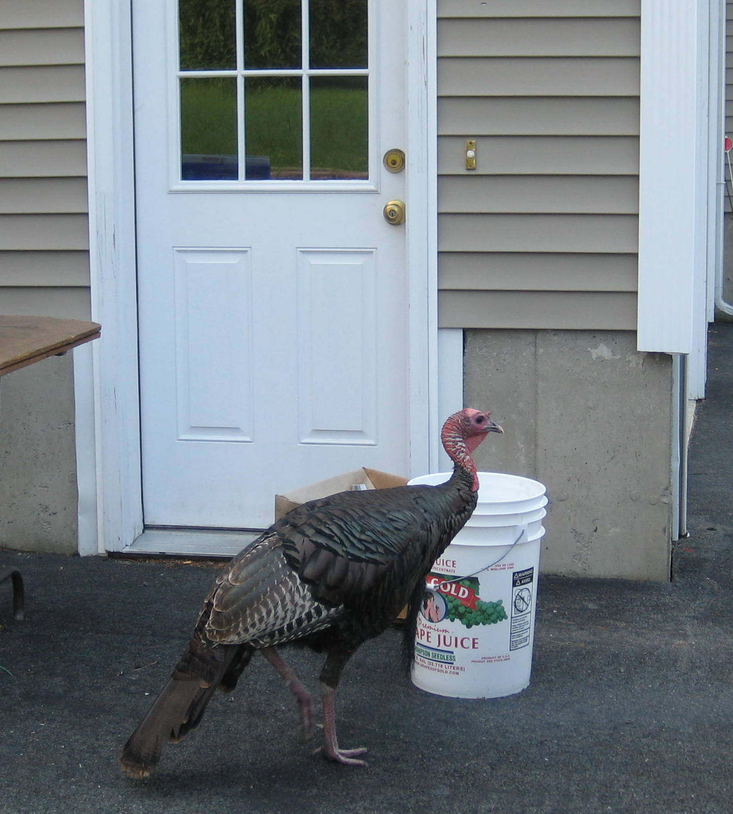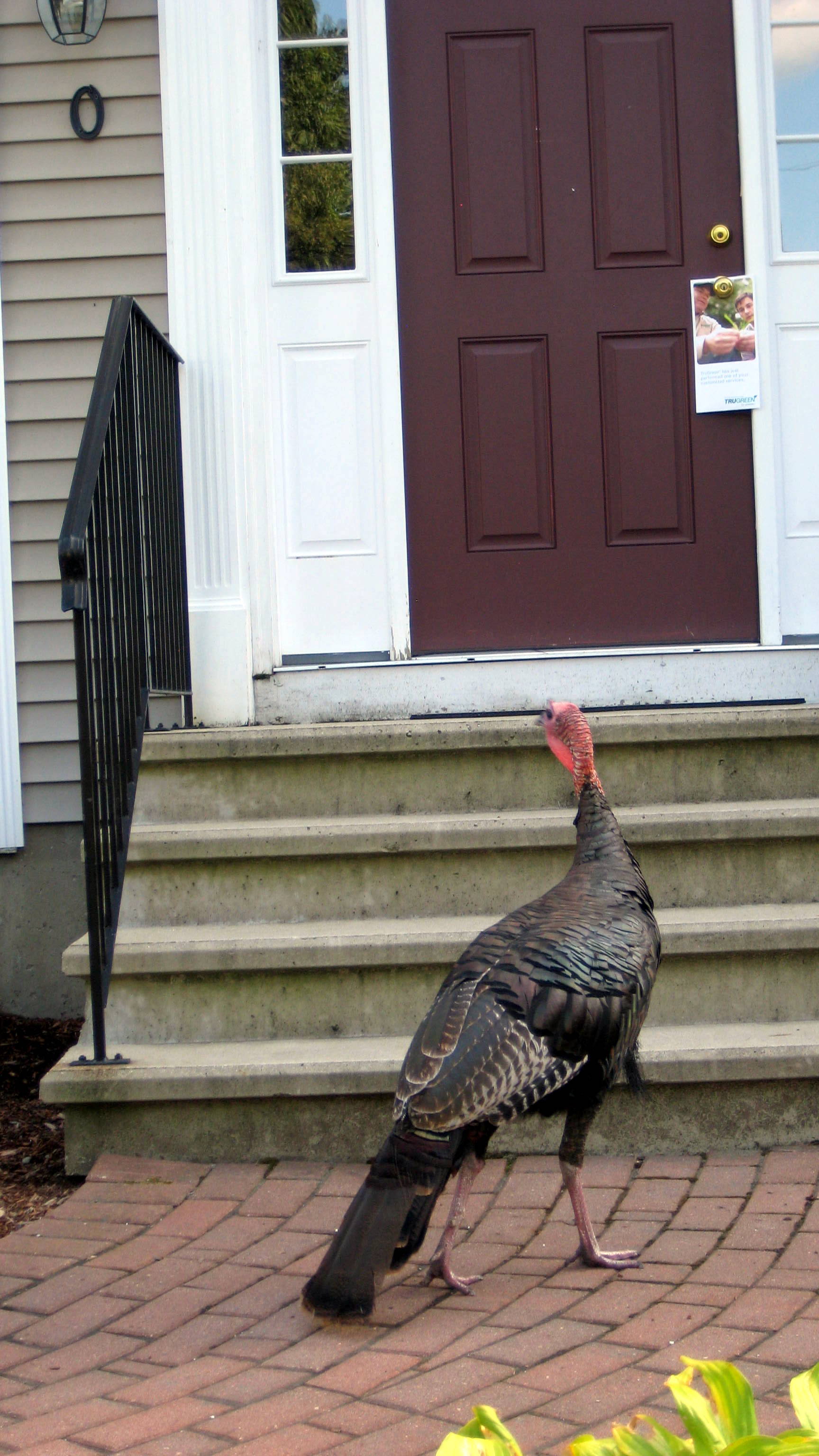 While driving home about an hour ago I saw a turkey heading toward a house.  After stopping my car in the road, I quietly emerged from the driver’s seat – camera in hand.  I tiptoed toward the turkey, while going back and forth behind some stranger’s parked truck so I could maneuver the turkey toward the door. I tiptoed; he tiptoed and…Voila…A turkey at the door! In fact, he went to the back door and the front door.