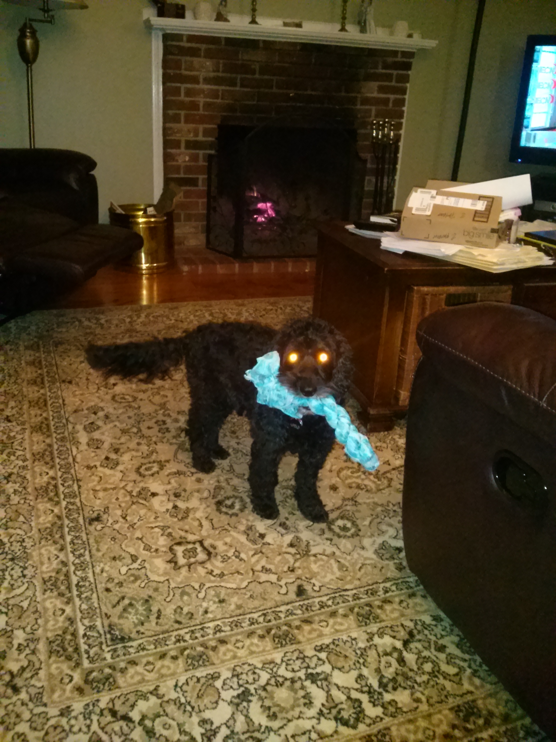We enjoyed the treats and our dogs loved the dog toy. It was one of those braided toys—blue in color. Our small dog is ten years older than our two-year-old golden retriever. The little dog particularly loved the toy, so being the “alpha” dog he rarely let the big dog take a turn. However, we played tug-of-war and “catch” with the new pull-toy. You see, it was his favorite toy—ever. I even snapped a photo to send to Anne-Brigitte, showing our little dog’s enjoyment of his new toy and sent her a text thanking her for the thoughtfulness toward our furry friends.