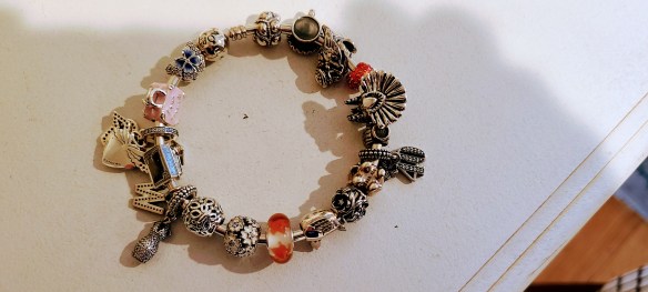 Also…just to share something about my books that’s meaningful to me. Next Wednesday would be Wyndham and my 48th anniversary. On our 40th anniversary, he thoughtfully gave me a special bracelet with charms representing each of my books. My kids have continued this tradition since he has been gone.