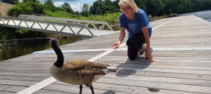 The “new” park is quiet, except on one night a week when it becomes a music venue. Perfect! And if that is not enough of a hug, as I go by the dock and dock house on the river each day, a lone goose greets me. This is particularly meaningful to me, as I wrote in one of my books about a lone goose that “adopted” my parents after losing its mate. Geese have a mate for life, and when they lose their mate they stay alone, sometimes attaching to a person for their new “mate.” Passing this lone goose each day just feels like a hug to me from God, and from Wyndham.